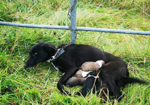 Cette pauvre chienne est retrouvée abandonnée et enchaînée à la clôture pendant qu’elle nourrit ses 6 chiots