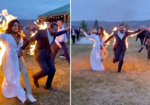 Un couple de jeunes mariés a fait une sortie spectaculaire lors de leur réception de mariage, mettant en scène une cascade effrayante qui impliquait de s’immoler délibérément par le