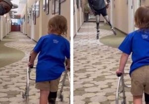 Un petit garçon de 2 ans fait ses premiers pas avec sa prothèse grâce à l’aide d’un athlète paralympique