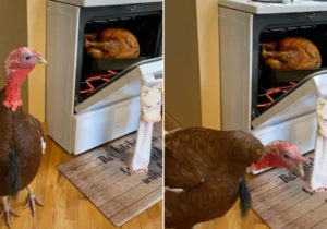 Elle se filme en train de montrer à sa dinde domestique l’autre dinde qu’elle est en train de cuire.