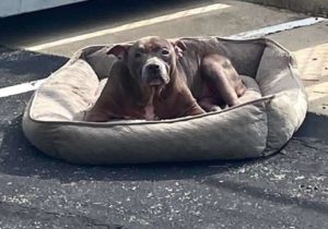 Une chienne maltraitée de 9 ans est abandonnée dans un parking avec seulement son vieux lit