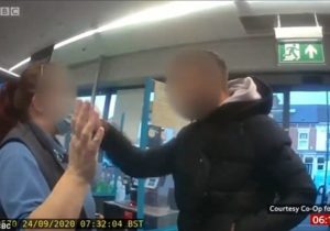 Une vidéo publiée par la BBC montre une altercation entre l’employée d’un petit commerce alimentaire et un client qui ne porte pas de masque. Après lui avoir demandé d’en