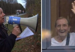 Il chante des chansons au mégaphone à son ami qui ne peut plus recevoir de visite en maison de retraite