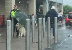 Un golden retriever attendait sagement son maître devant la porte d’un supermarché en Ecosse quand la pluie s’est mise à tomber. Ethan Dearman, agent de sécurité, a vu le