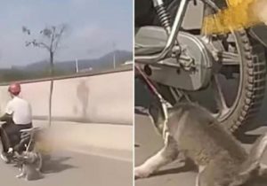 Un homme est filmé en train de traîner de force un chien husky à l’aide de son scooter.