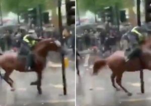 Lors des manifestations à Londres, la tête d’une policière à cheval heurte violemment un feu tricolore