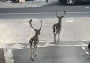 Près de Paris, deux daims se promènent tranquillement dans une rue déserte