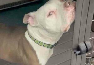 Ce pauvre chien appuie son menton contre la porte du chenil pour se faire remarquer. Il cherche un foyer depuis 4 ans.
