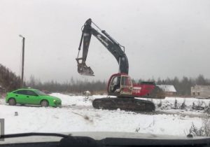 Ne pas emmerder un mec avec une pelleteuse. En Russie, une pelleteuse bloque la route à une voiture verte qui arrive en face. Les deux hommes à l’intérieur ne