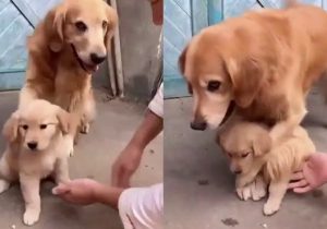 Une golden retriever ne veut pas qu’on touche à son chiot. En Chine, un homme essaie de toucher un chiot, mais la chienne veille sur le petit et le