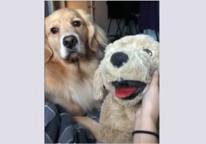 Une femme utilise une peluche pour tester la jalousie de sa chienne Sadie, une golden retriever. Tandis qu’elle caresse tendrement la peluche en lui faisant des compliments, Sadie regarde
