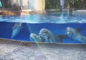 Un groupe de dauphins a fait preuve d’une grande curiosité en regardant deux écureuils à travers la vitre d’un bassin au parc Dolphin Nursery à Orlando, en Floride. Les