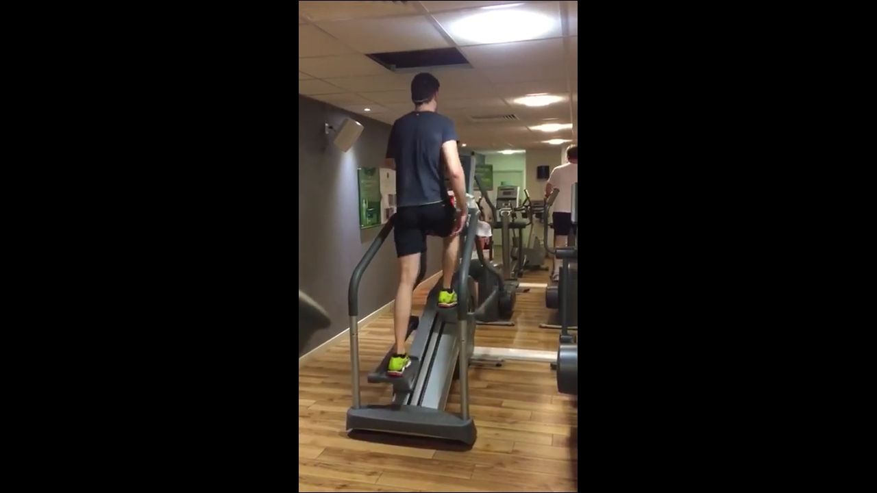 Un homme fait du stepper dans une salle de sport mais, étant trop grand par rapport à la hauteur de la salle, il a dû retirer une dalle du