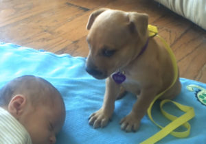 Ce mignon chiot a la plus adorable des réactions en voyant comment le bébé s’est endormi