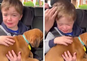 Ce petit enfant serre dans ses bras son premier chiot et n’a pu retenir ses larmes d’émotion