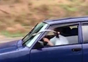 La technique est assez spéciale pour permettre au conducteur de voir sur l’autoroute. Un homme conduit sous la pluie pendant que des enfants font aller manuellement les essuie-glaces cassés