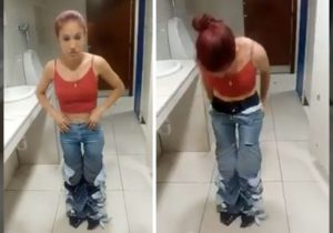 Une femme s’est fait prendre en train de voler des jeans qu’elle portait sur elle. La vidéo ci-dessous montre la jeune femme en train d’enlever tous les pantalons un