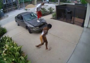 À Houston, au Texas, un couple d’automobilistes s’arrête rapidement dans une allée pour redresser le capot de sa voiture accidentée. En moins d’une minute, l’homme sort de son véhicule