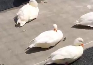 Plusieurs canards sont posés sur le sol et profitent du soleil. Un des canards a l’air de plus en profiter que les autres, devinerez-vous lequel ? Un des canards