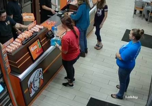 Sur les images de la caméra de surveillance, cette cliente en bleu attend patiemment son tour pour commander une pizza. Elle ignore que dans quelques secondes la porte derrière
