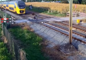 Un cycliste évite un train de justesse en franchissant un passage à niveau non gardé aux Pays-Bas. En effet, un premier train en cache un second qui ne passe