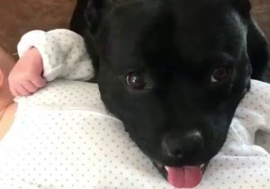 Django le chien s’est fait un nouvel ami et il ne veut pas le quitter une seule seconde. Le chien a la tête posée sur le ventre du bébé